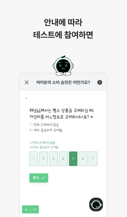 앱을 설치하고 기본적인 질문에 답하면, 이후에는 간단한 설문조사가 정기적으로 발송됩니다. 설문은 간단하고 빠르게 완료할 수 있어, 여유 시간에 쉽게 참여할 수 있습니다.