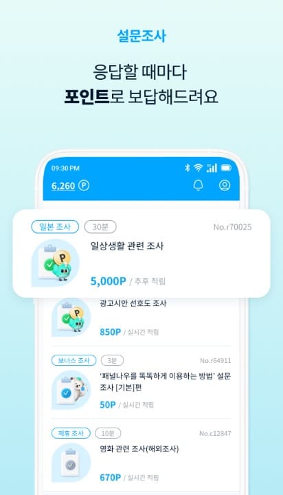 설문 참여를 놓치지 않도록 푸시 알림 기능이 지원됩니다. 새로운 설문이 등록되면 바로 알림을 통해 참여를 유도하고, 이를 통해 사용자는 빠르게 설문에 응답할 수 있습니다. 알림 기능을 통해 설문을 놓치는 일이 줄어들고, 포인트 적립 기회를 극대화할 수 있습니다.