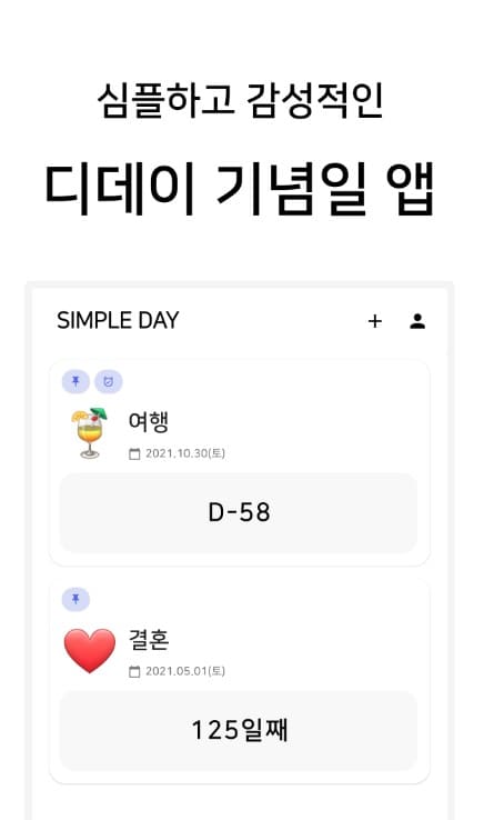 심플데이는 복잡함을 걷어낸 깔끔하고 직관적인 디데이 & 기념일 관리 앱입니다. 사용자 경험을 최우선으로 설계되어 누구나 쉽게 소중한 날짜를 기록하고 확인할 수 있으며, 위젯과 상단바 고정 기능을 통해 중요한 날을 놓치지 않도록 도와줍니다. 매일 바쁜 일상 속에서도 사랑하는 사람과의 기념일, 중요한 목표일, 나만의 특별한 디데이를 간편하게 관리하고 싶다면, 꼭 필요한 앱입니다. 디데이 알람과 간편한 인터페이스를 통해 더욱 유용하게 사용할 수 있으며, 미니멀하면서도 꼭 필요한 기능만을 담아 실용성과 편리함을 동시에 갖춘 앱입니다.