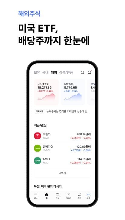 미국 주식, 회사채, ETF 등 다양한 해외 금융 상품을 하나의 플랫폼에서 거래할 수 있는 통합 서비스를 제공합니다. 글로벌 트렌드와 필수 투자 정보가 담긴 해외 홈 서비스가 별도로 마련되어 있어 해외 투자에 대한 접근성을 높이고, AI 기반 토픽 검색 기능으로 실시간으로 관심 있는 미국 주식을 쉽고 빠르게 찾아볼 수 있습니다.