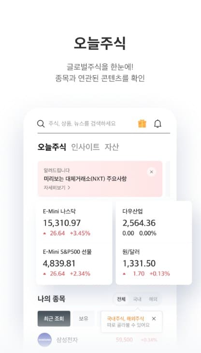 국내 주식은 물론 미국, 중국, 홍콩 시장의 실시간 시세를 제공하며, 비상장 주식과 디지털 자산 정보까지 포함해 글로벌 자산을 폭넓게 확인할 수 있습니다. 시간차 없이 빠르게 시장의 움직임을 파악하고 다양한 자산을 한눈에 비교해보세요.