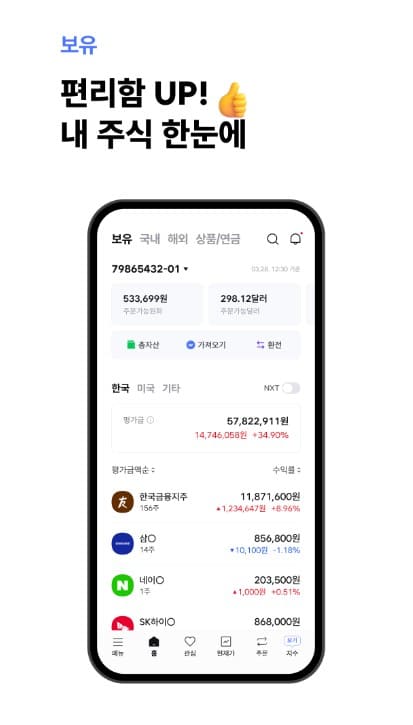 앱 하나로 국내 주식은 물론 해외 주식, 선물옵션, 금현물, 채권, 연금, 펀드, ELS/DLS, ISA, RP 등 다양한 금융상품을 거래할 수 있습니다. 투자 포트폴리오를 한 곳에서 효율적으로 관리할 수 있도록 도와주며, 전문 투자자뿐만 아니라 처음 투자하는 사용자도 쉽게 접근할 수 있도록 구성되어 있습니다.