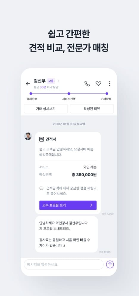 업체를 찾기 위해 이곳저곳 전화하며 같은 말을 반복할 필요가 없습니다. 앱에서 내가 원하는 조건과 상황을 담은 요청서를 보내기만 하면, 해당 분야의 고수들이 이를 확인하고 채팅으로 견적서와 프로필을 보내옵니다. 사용자는 앉아서 도착한 견적들을 비교하고 선택하기만 하면 됩니다.